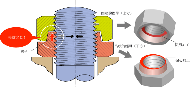 他想到的方法,是在一個(gè)螺絲釘上使用呈“凹”“凸”形狀的兩種螺母。下方呈凸?fàn)畹穆菽福诩庸r(shí)中心稍許錯(cuò)動(dòng)(偏心加工),起到楔子的作用。上方呈凹狀的螺母,則不作偏離中心的加工(圓形加工),于是形成了錘子揳打楔子的功能。(圖2)這樣的兩個(gè)螺母合二為一,松動(dòng)問題就迎刃而解了。