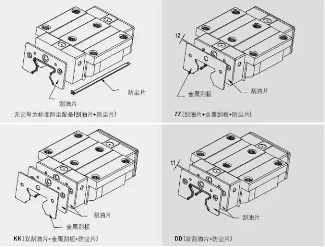 1.刮油片及底部防塵主要阻止鐵屑或粉塵顆粒進入滑塊,破壞珠道表面而降低線軌使用壽命;