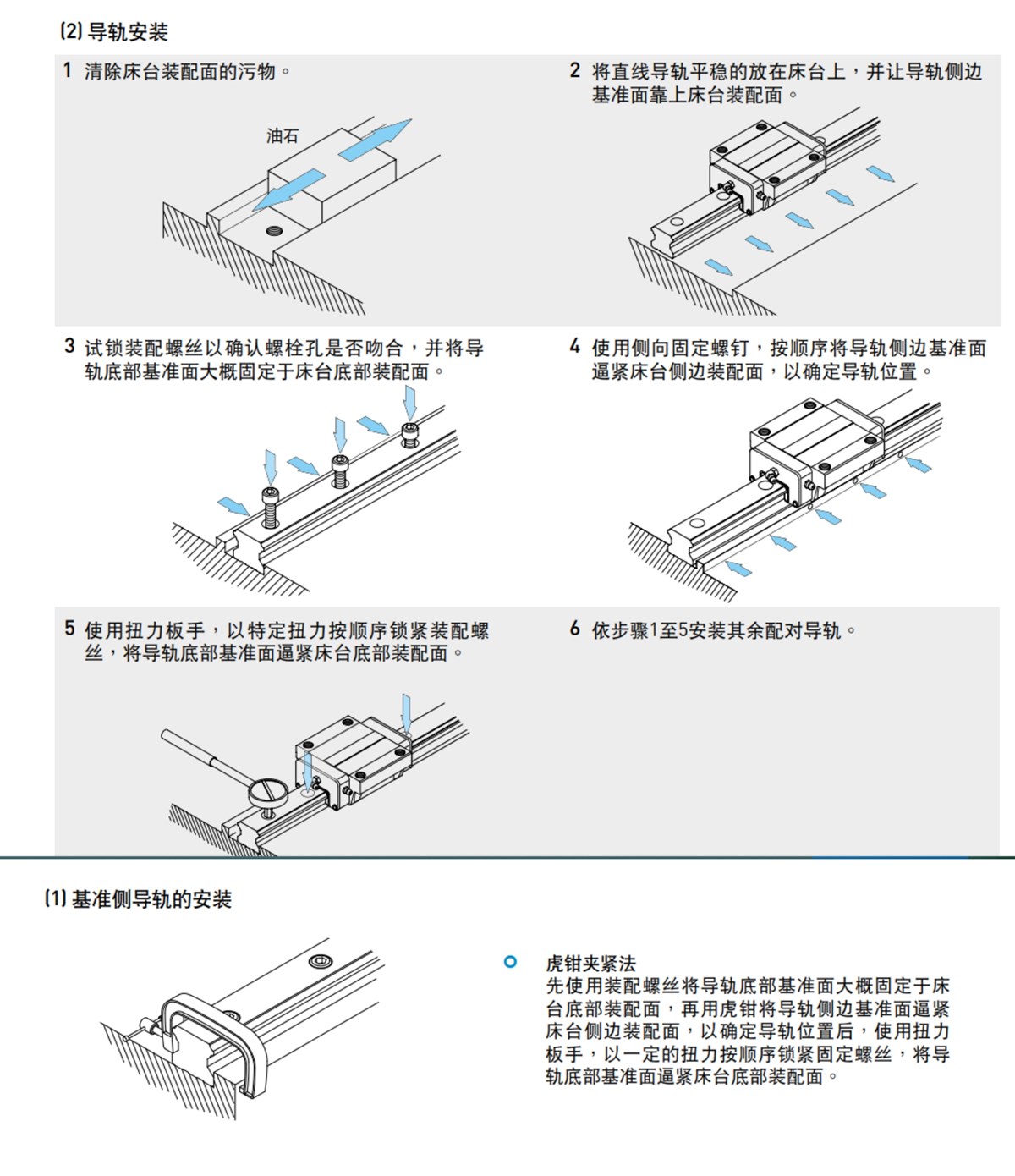 安裝直線導軌時要十分集中,否則會造成左右不均勻,導致精度下降等原因。安裝時,一般的操作手法是,先將四面的螺絲套上,不緊不慢,同時套緊,不能單一螺絲擰緊。