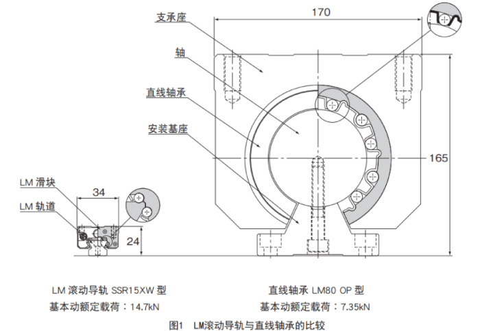 直線導軌將滾動面設計成R槽形狀,使滾珠和滾動面形成“面接觸”。與直線軸承等“點接觸”類型的導向部件相比,直線導軌的容許負荷約為其13倍,直線導軌與直線軸承等“點接觸”的直線導向部件相比,即使容許負荷相同,也可以設計得更加緊湊。