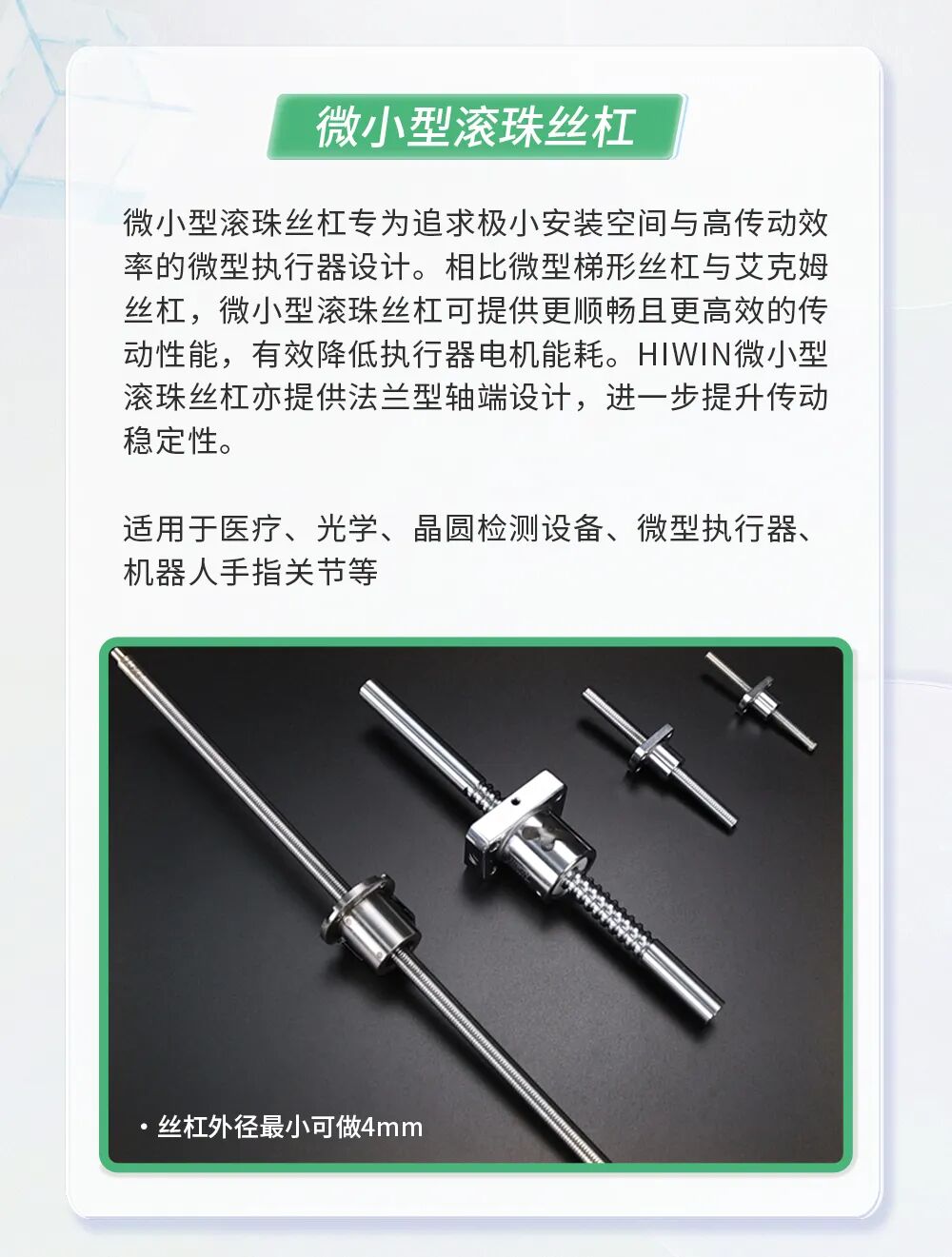 微小型滾珠絲杠專為追求極小安裝空間與高傳動效率的微型執(zhí)行器設計。相比微型梯形絲杠與艾克姆絲杠,微小型滾珠絲杠可提供更順暢且更高效的傳動性能,有效降低執(zhí)行器電機能耗。HIWIN微小型滾珠絲杠亦提供法蘭型軸端設計,進一步提升傳動穩(wěn)定性。