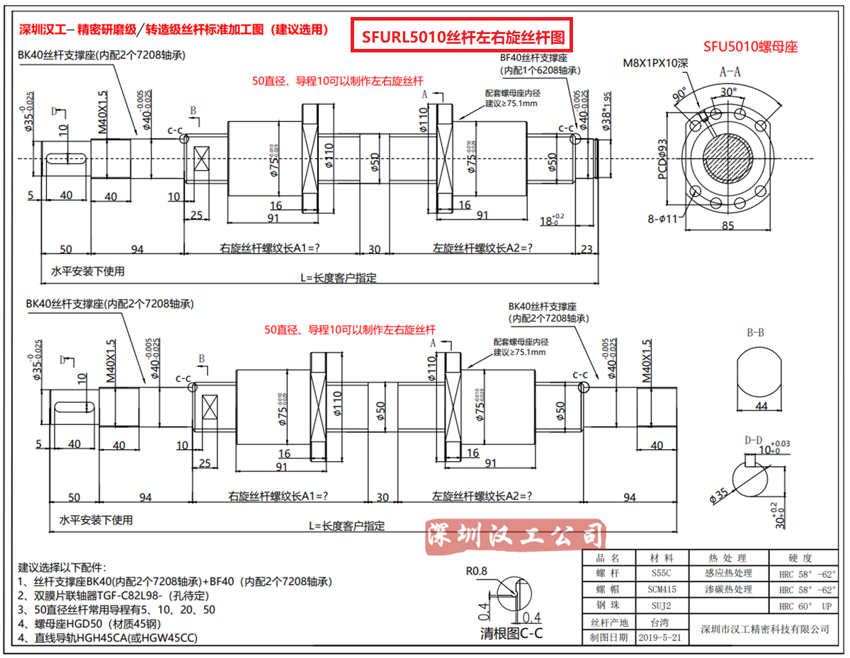 25直徑左右旋絲桿:SFU2505、SFU2510